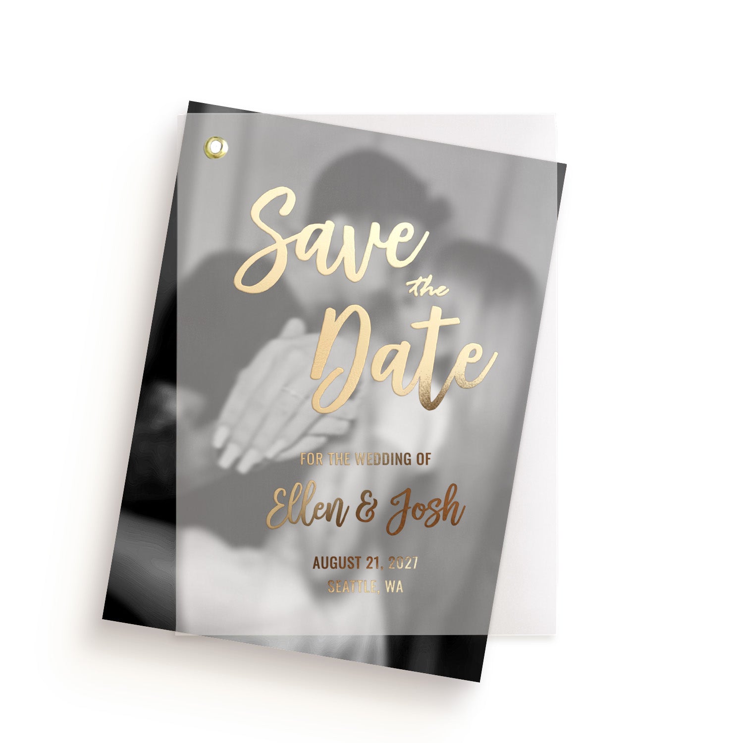 Tell your friends and family to mark their calendar for your special wedding day with personalized and very elegant save the day card. Printed with real gold foil on a vellum, this card is the unique first impression you are looking for. Backed with the most special picture of you to represent your love in the most special way possible. Timeless elegance makes thisve the date invitation the beautiful announcement of the new chapter of your life.